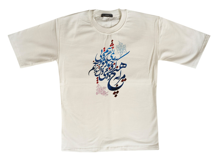 تیشرت با شعر نوشته: مرا به هیچ بدادی و من هنوز برآنم که از وجود تو مویی به عالمی نفروشم